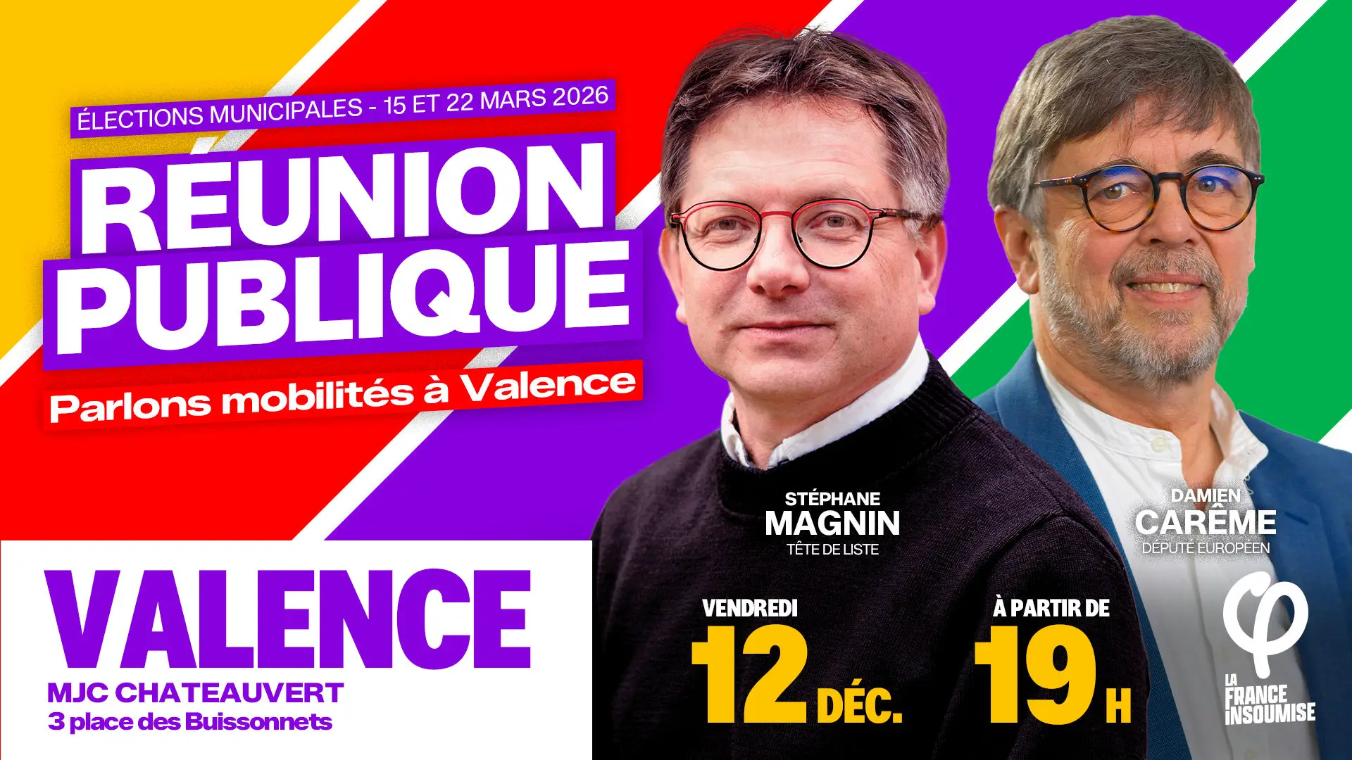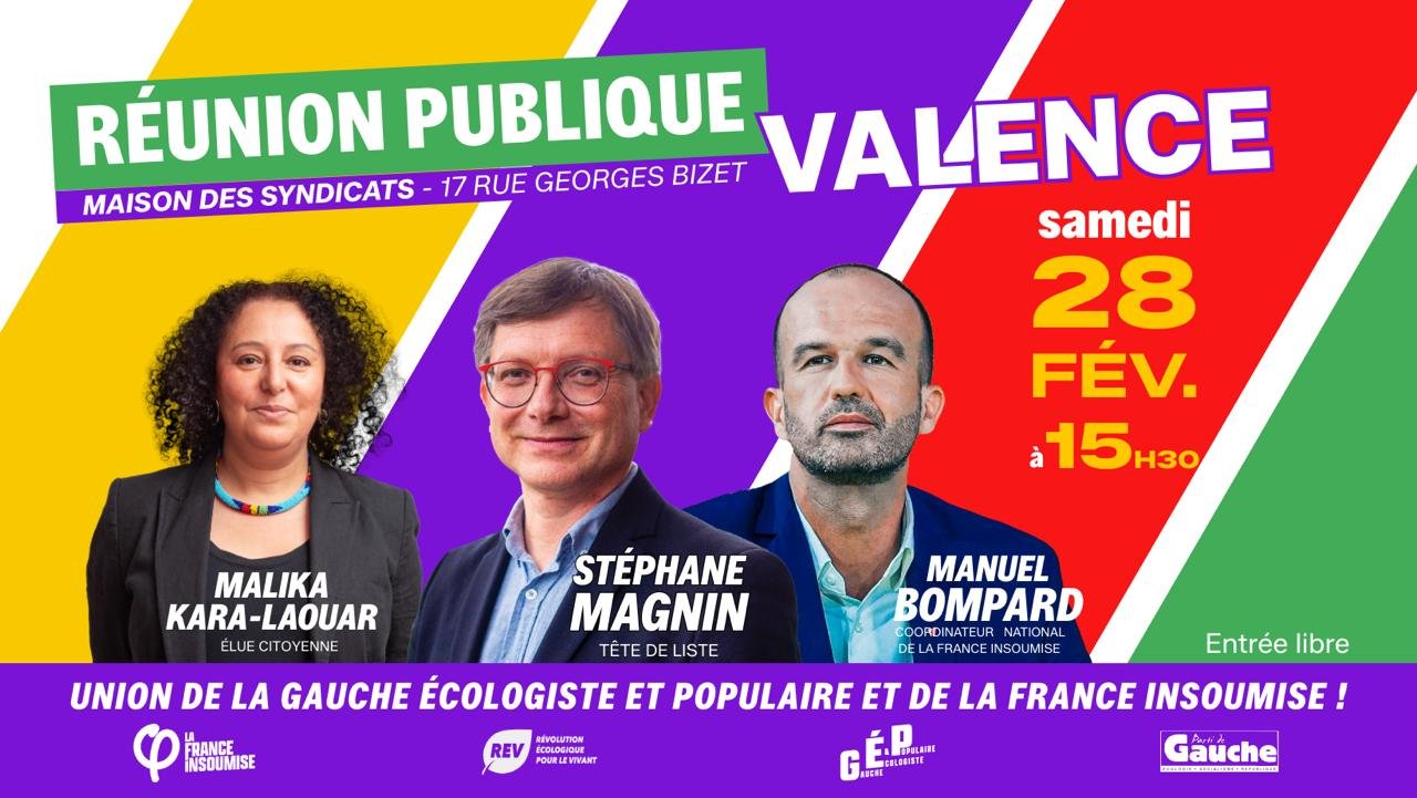 Nous vous invitons à notre grande réunion publique pour faire mieux pour Valence avec Stéphane Magnin et Manuel Bompard, coordinateur national de la France insoumise et député de Marseille.