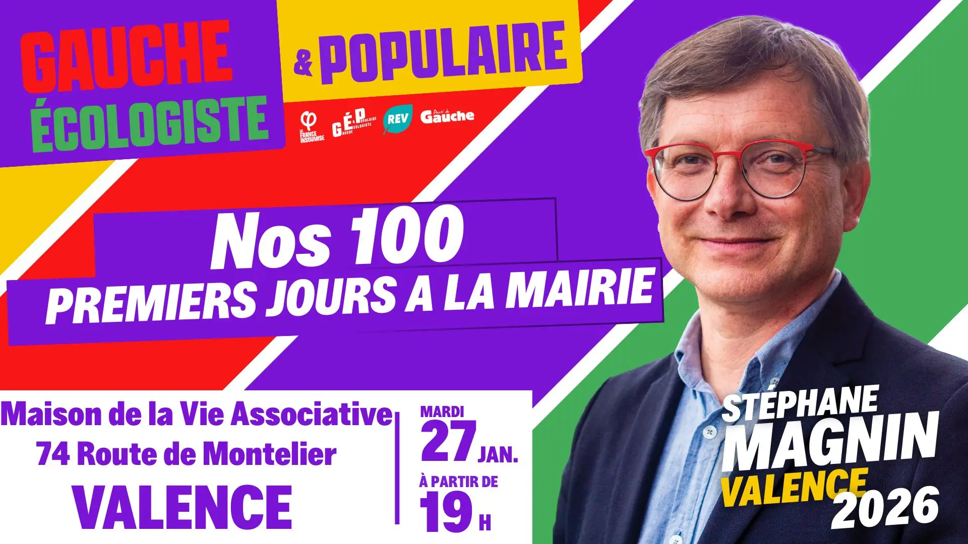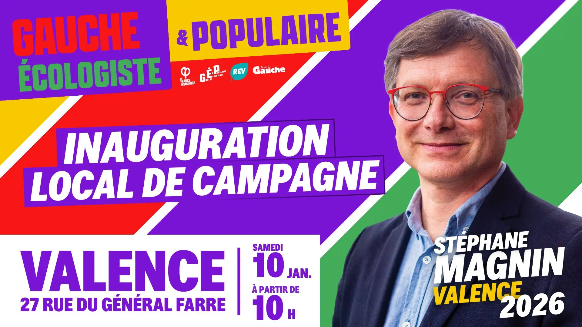 Nous vous invitons toutes et tous à l'inauguration du local de campagne de Stéphane Magnin, de ses colistières et colistiers de l'union de la Gauche Écologiste et Populaire et de la France insoumise le samedi 10 janvier à 10h au 27 rue du général Farre à Valence.